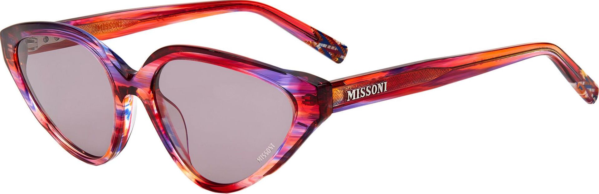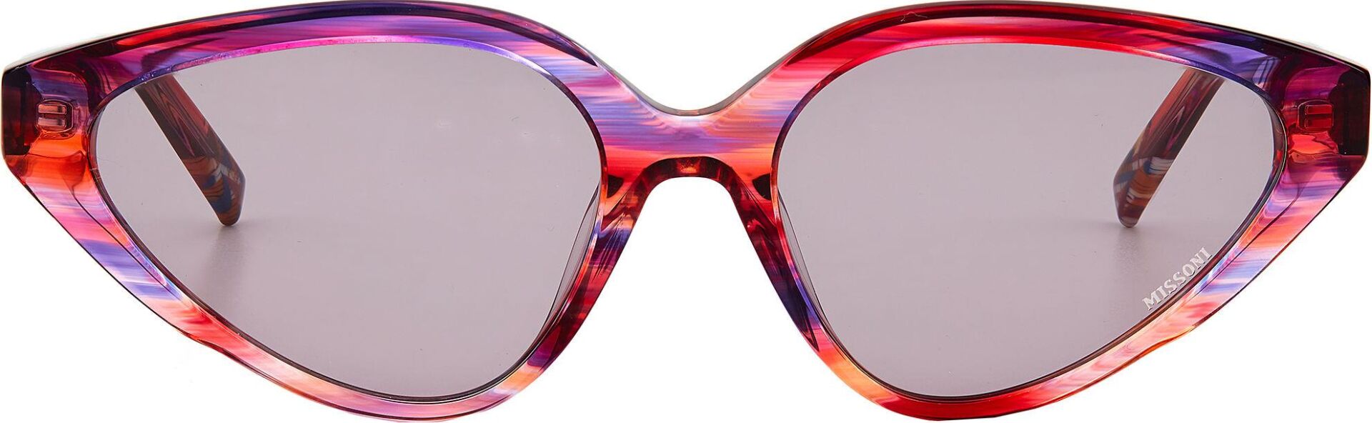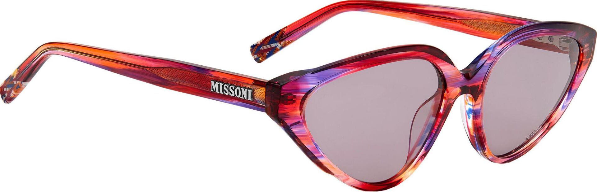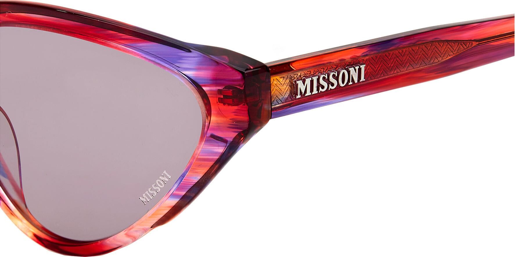 Güneş gözlüğü, markanın ikonik kumaşlarını sofistike asetat çerçevelerle birleştirir. İnce metal saplar, Missoni'nin zengin mirasının etkileyici bir şekilde kutlanmasında ayırt edici zikzak profillerle geliştirilmiştir. Özel bir dokunuş için lazerle işlenmiş logo ayrıntılarıyla süslenmiştir. Ön kısımda metal perçinlerle tamamlanmıştır.