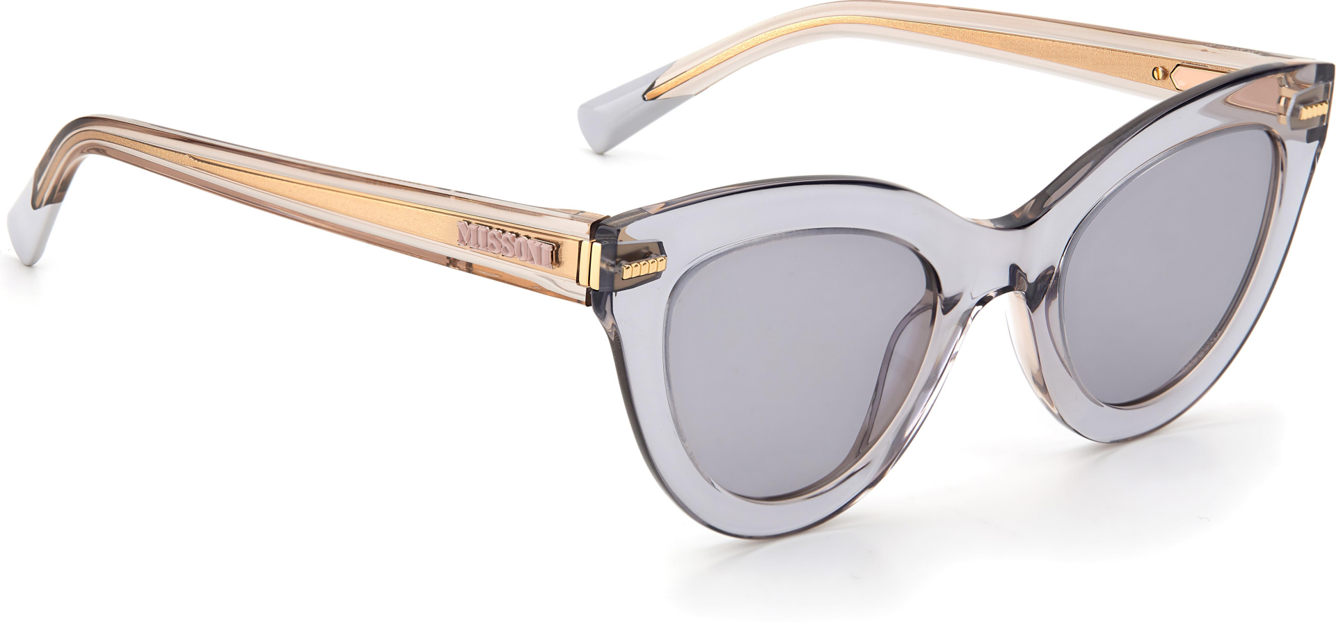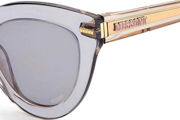 Güneş gözlüğü, markanın ikonik kumaşlarını sofistike asetat çerçevelerle birleştirir. İnce metal saplar, Missoni'nin zengin mirasının etkileyici bir şekilde kutlanmasında ayırt edici zikzak profillerle geliştirilmiştir. Özel bir dokunuş için lazerle işlenmiş logo ayrıntılarıyla süslenmiştir. Ön kısımda metal perçinlerle tamamlanmıştır.