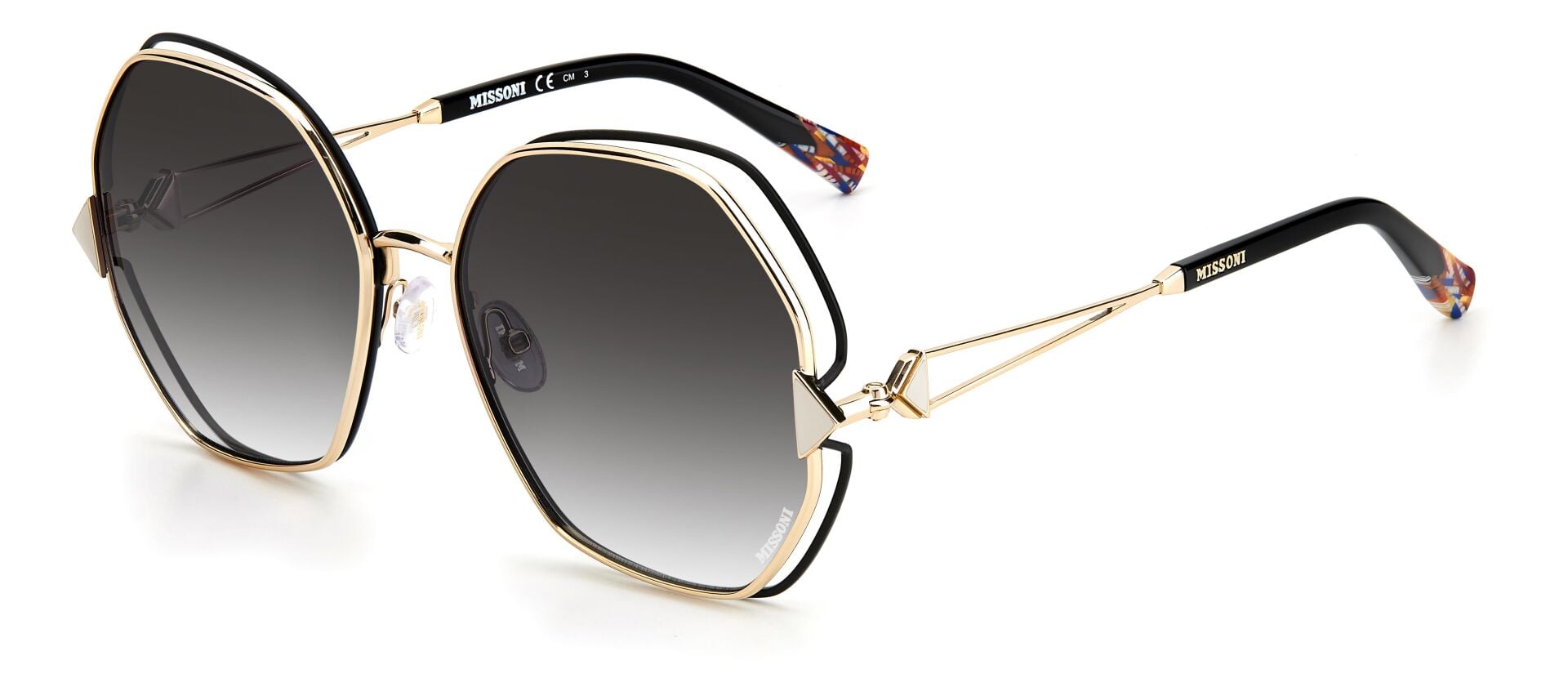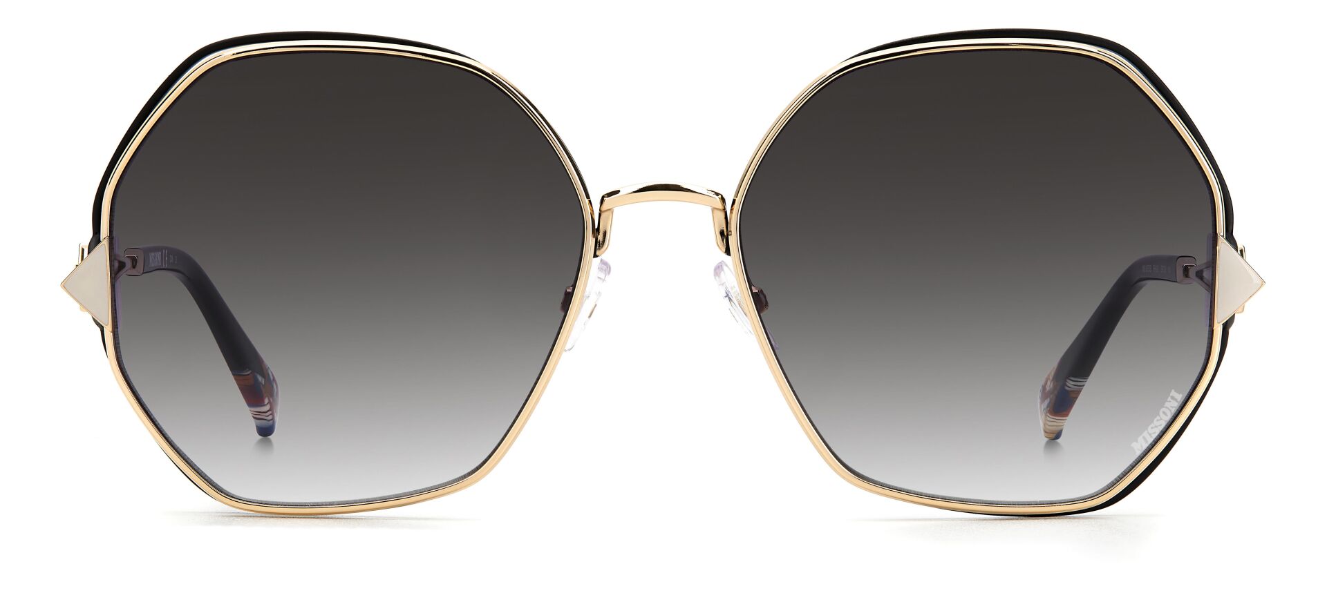 Güneş gözlüğü, markanın ikonik kumaşlarını sofistike asetat çerçevelerle birleştirir. İnce metal saplar, Missoni'nin zengin mirasının etkileyici bir şekilde kutlanmasında ayırt edici zikzak profillerle geliştirilmiştir. Özel bir dokunuş için lazerle işlenmiş logo ayrıntılarıyla süslenmiştir. Ön kısımda metal perçinlerle tamamlanmıştır.