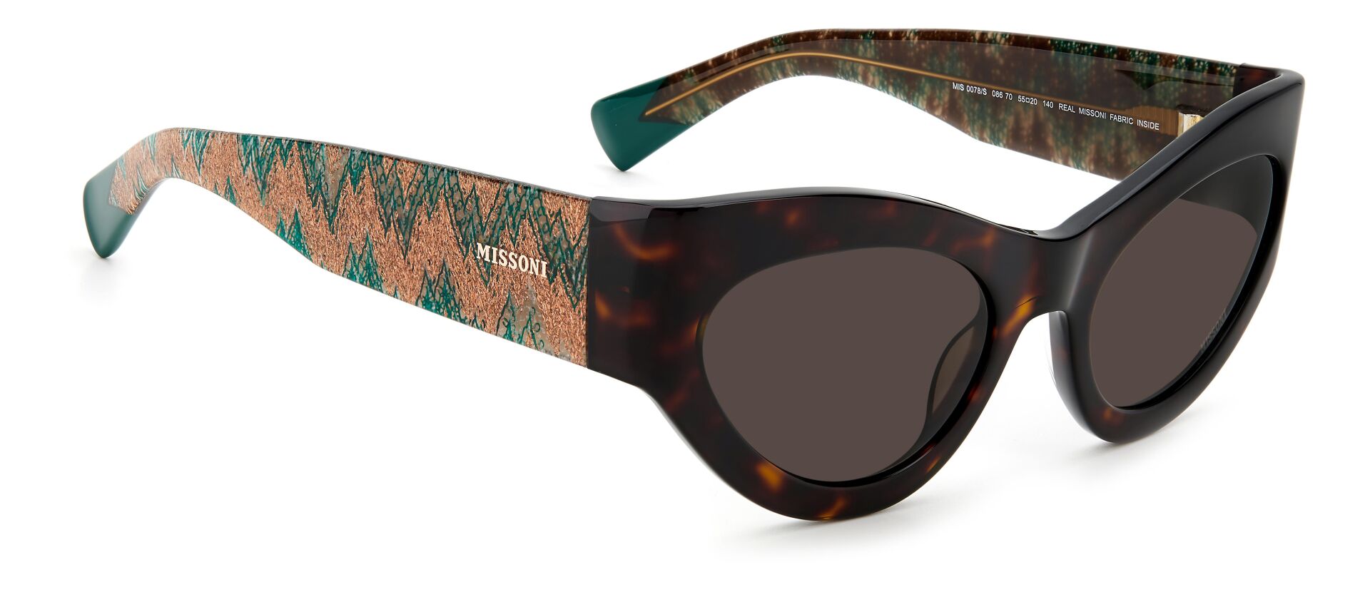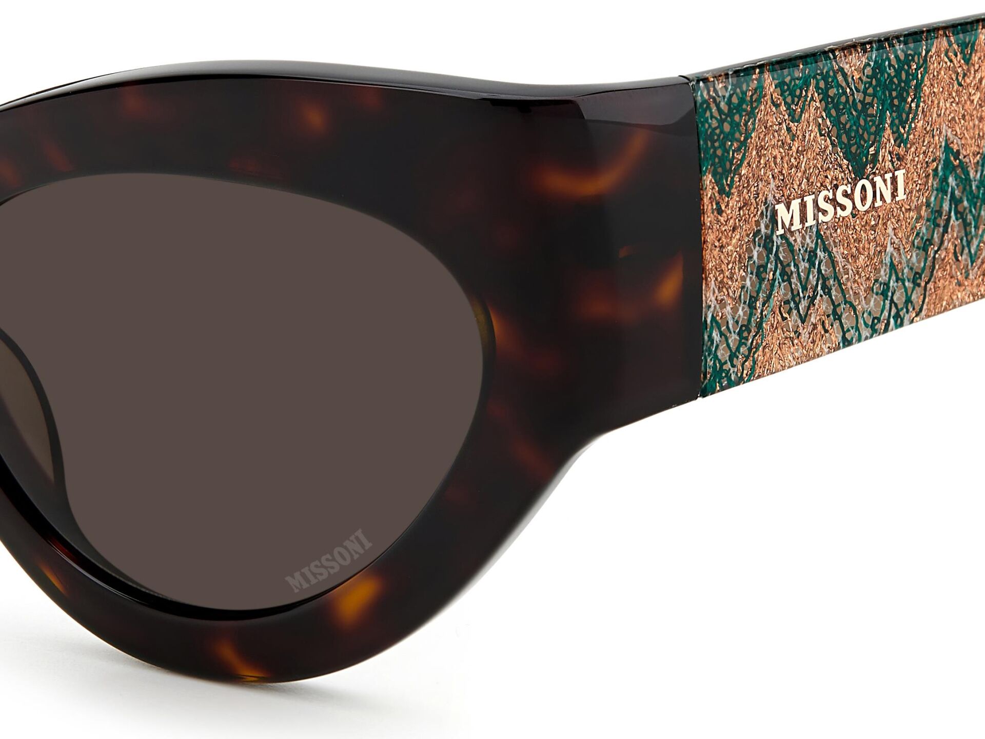Güneş gözlüğü, markanın ikonik kumaşlarını sofistike asetat çerçevelerle birleştirir. İnce metal saplar, Missoni'nin zengin mirasının etkileyici bir şekilde kutlanmasında ayırt edici zikzak profillerle geliştirilmiştir. Özel bir dokunuş için lazerle işlenmiş logo ayrıntılarıyla süslenmiştir. Ön kısımda metal perçinlerle tamamlanmıştır.