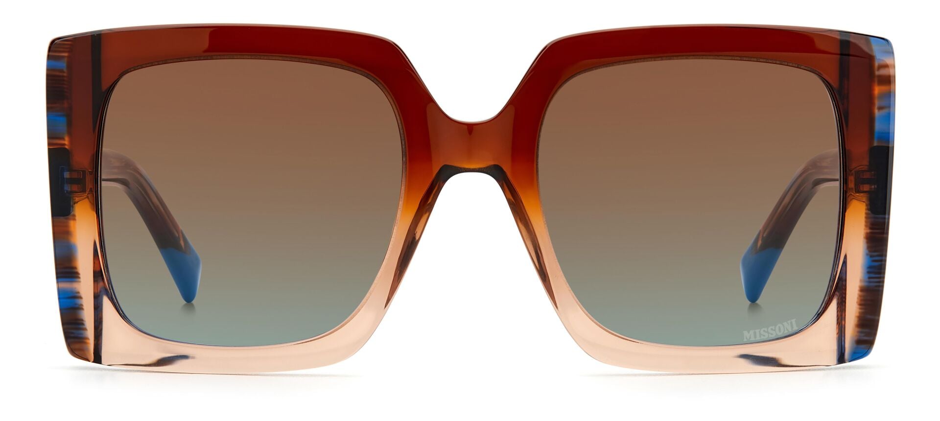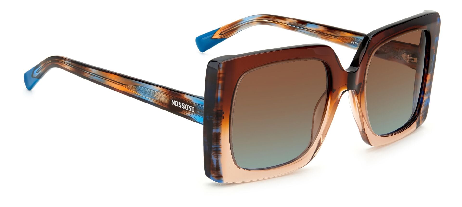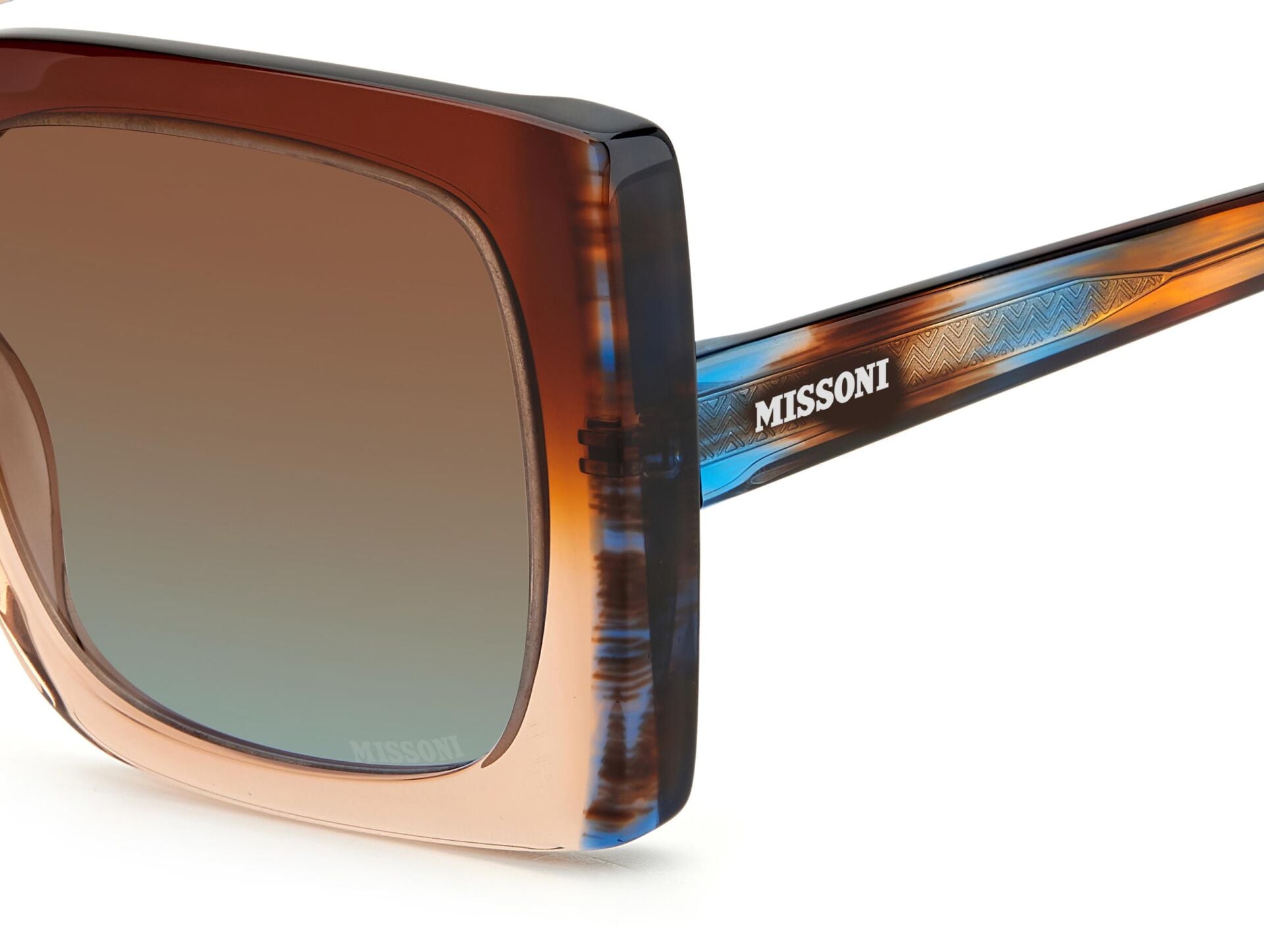 Güneş gözlüğü, markanın ikonik kumaşlarını sofistike asetat çerçevelerle birleştirir. İnce metal saplar, Missoni'nin zengin mirasının etkileyici bir şekilde kutlanmasında ayırt edici zikzak profillerle geliştirilmiştir. Özel bir dokunuş için lazerle işlenmiş logo ayrıntılarıyla süslenmiştir. Ön kısımda metal perçinlerle tamamlanmıştır.
